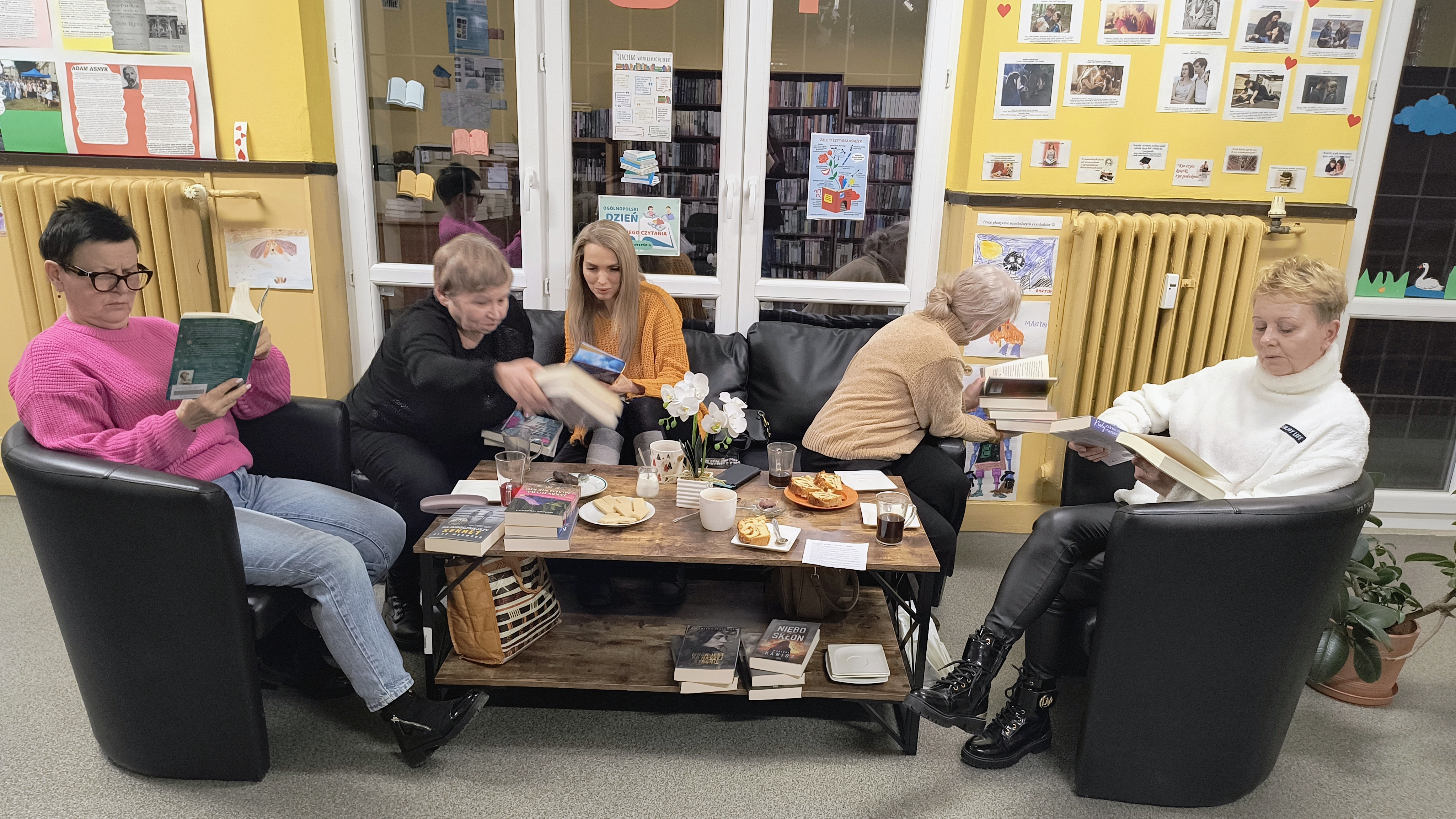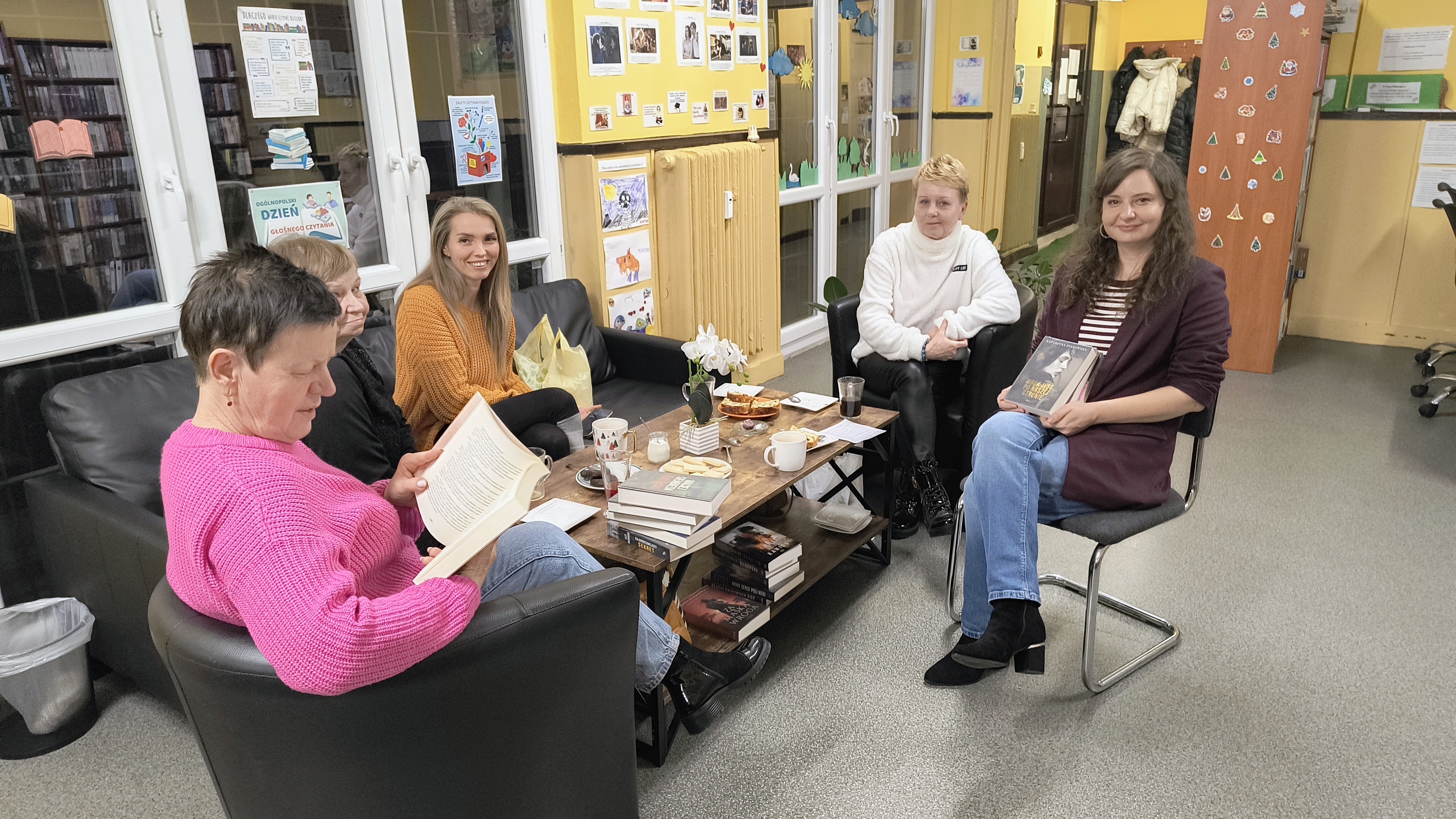 Druga część spotkania upłynęła w niezwykle miłej, kameralnej atmosferze – przy kawie i domowym cieście. Rozmowy szybko wyszły poza książki: wspólnie poruszaliśmy tematy związane z najbliższą okolicą, ciekawostki z historii osiedla oraz zmiany zachodzące w naszym sąsiedztwie. Pomysłów i wątków do dyskusji nie brakowało – tematom naprawdę nie było końca.