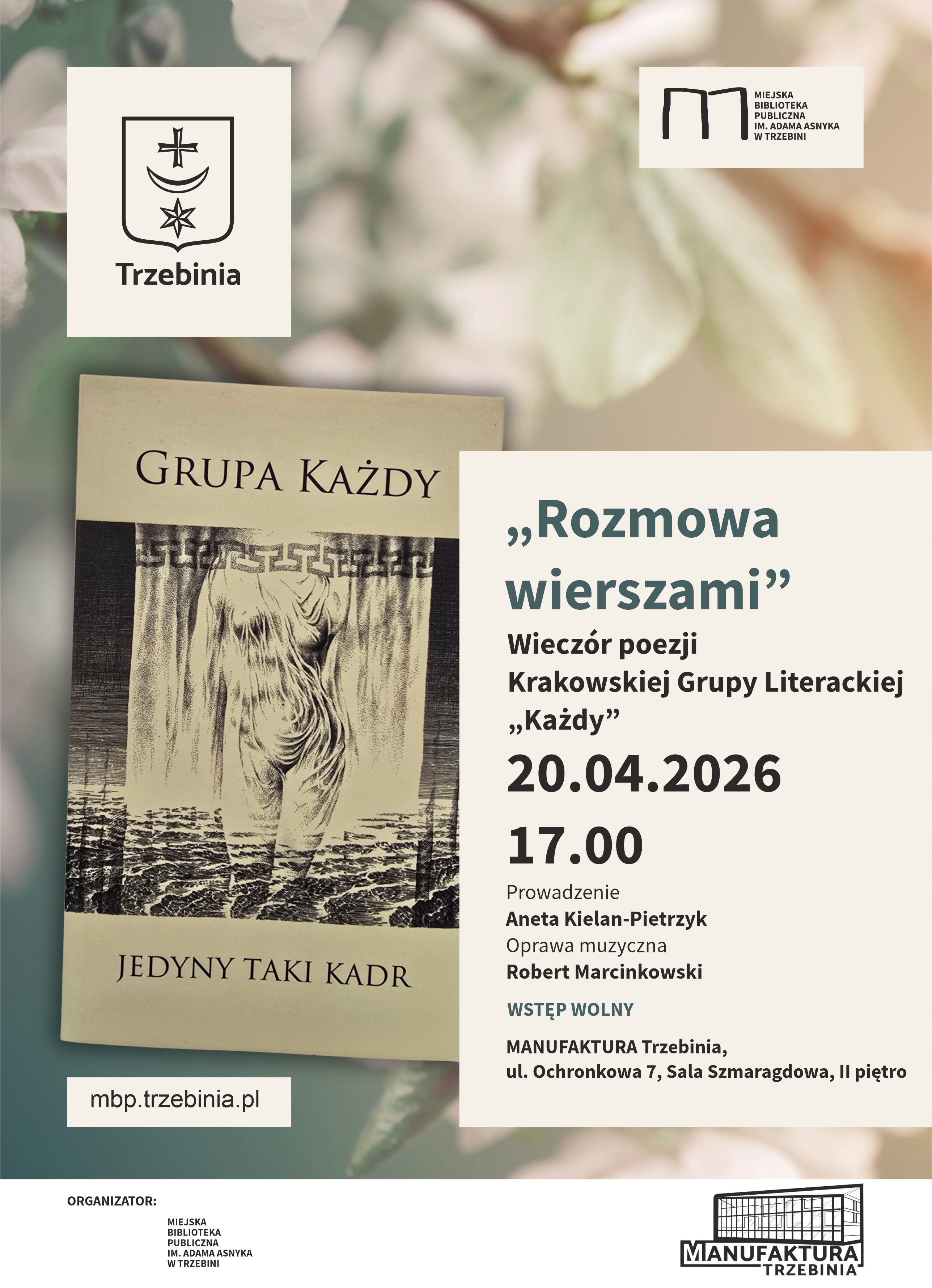 Istniejąca od 30 lat Krakowska Grupa Literacka „Każdy” już wkrótce odwiedzi Manufakturę, by podzielić się swoją twórczością z wszystkimi miłośnikami poezji. 20 kwietnia o godzinie 17:00 zapraszamy serdecznie na „Rozmowę wierszami”. Będzie to okazja, by poznać historię Grupy, wziąć do ręki piękne almanachy, a przede wszystkim wsłuchać się w słowa i poczuć emocje zamknięte w wierszach. Spotkanie poprowadzi Aneta Kielan-Pietrzyk, a o oprawę muzyczną zadba Robert Marcinkowski. Serdecznie zapraszamy.