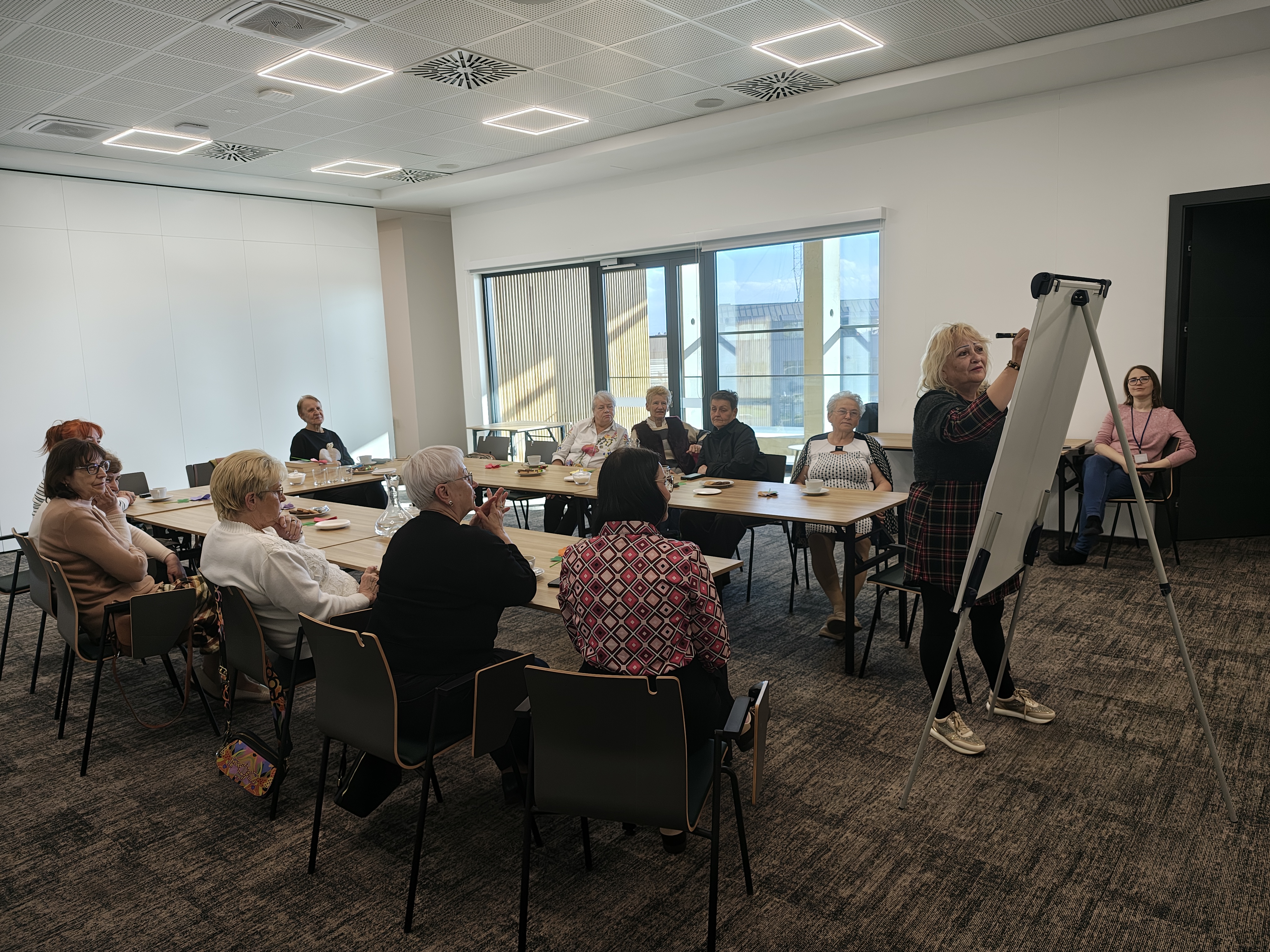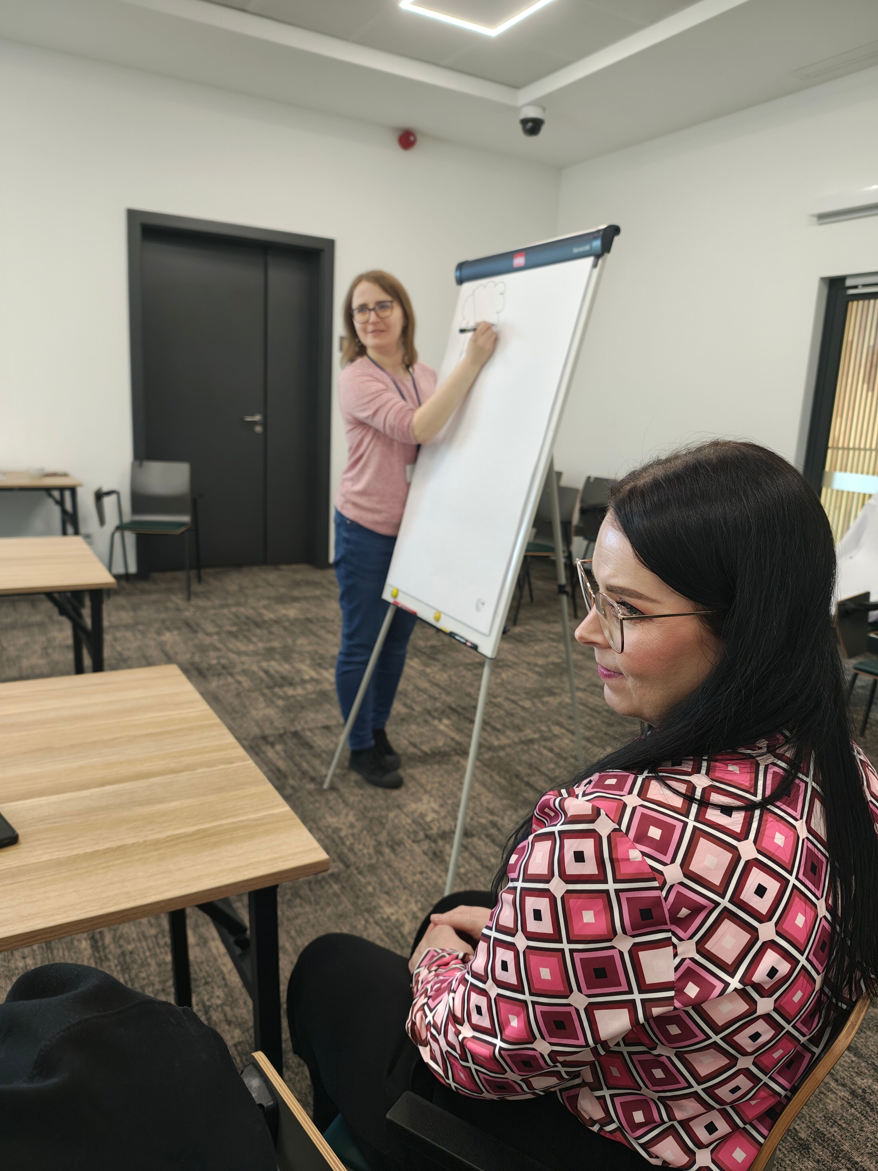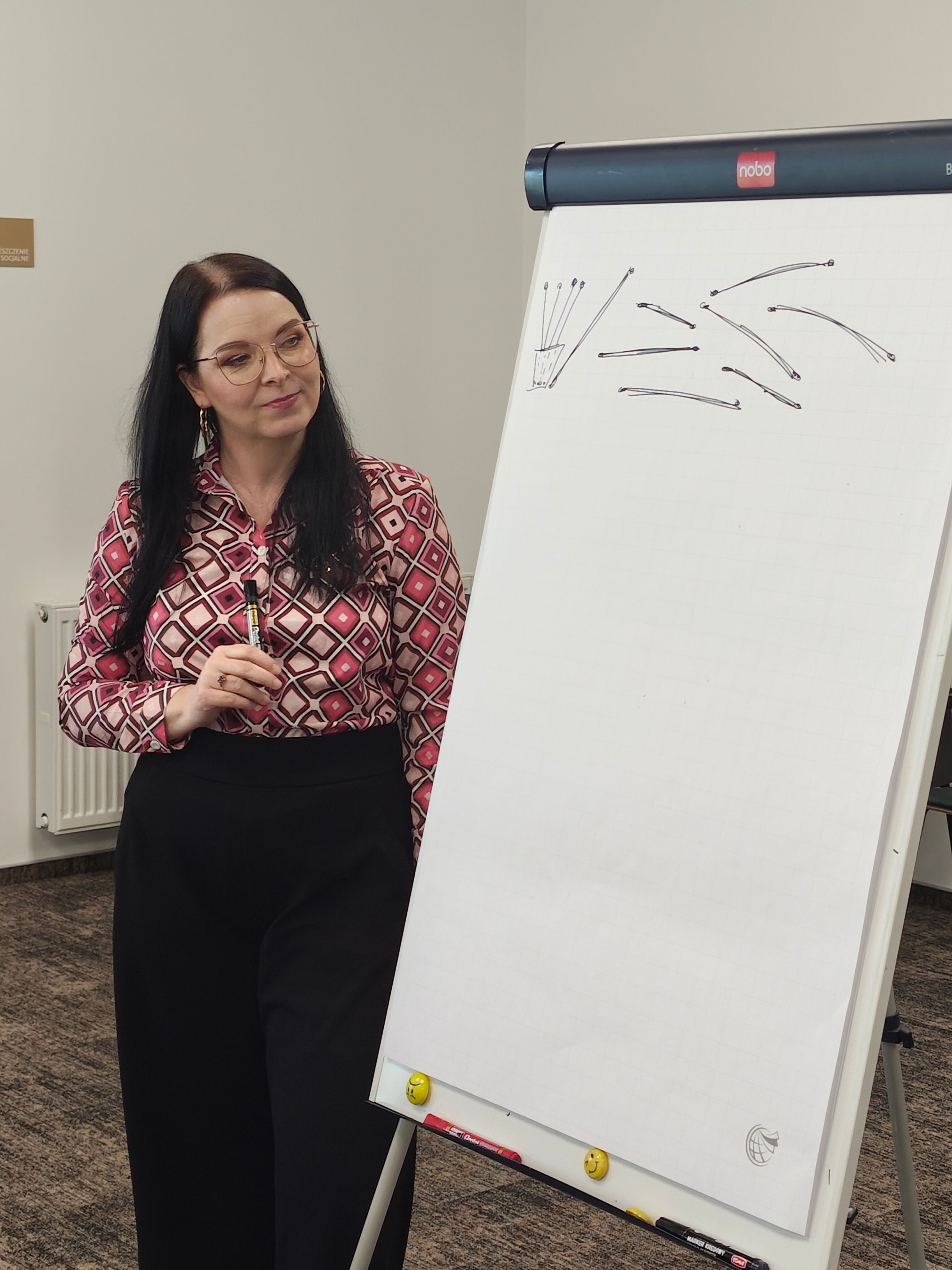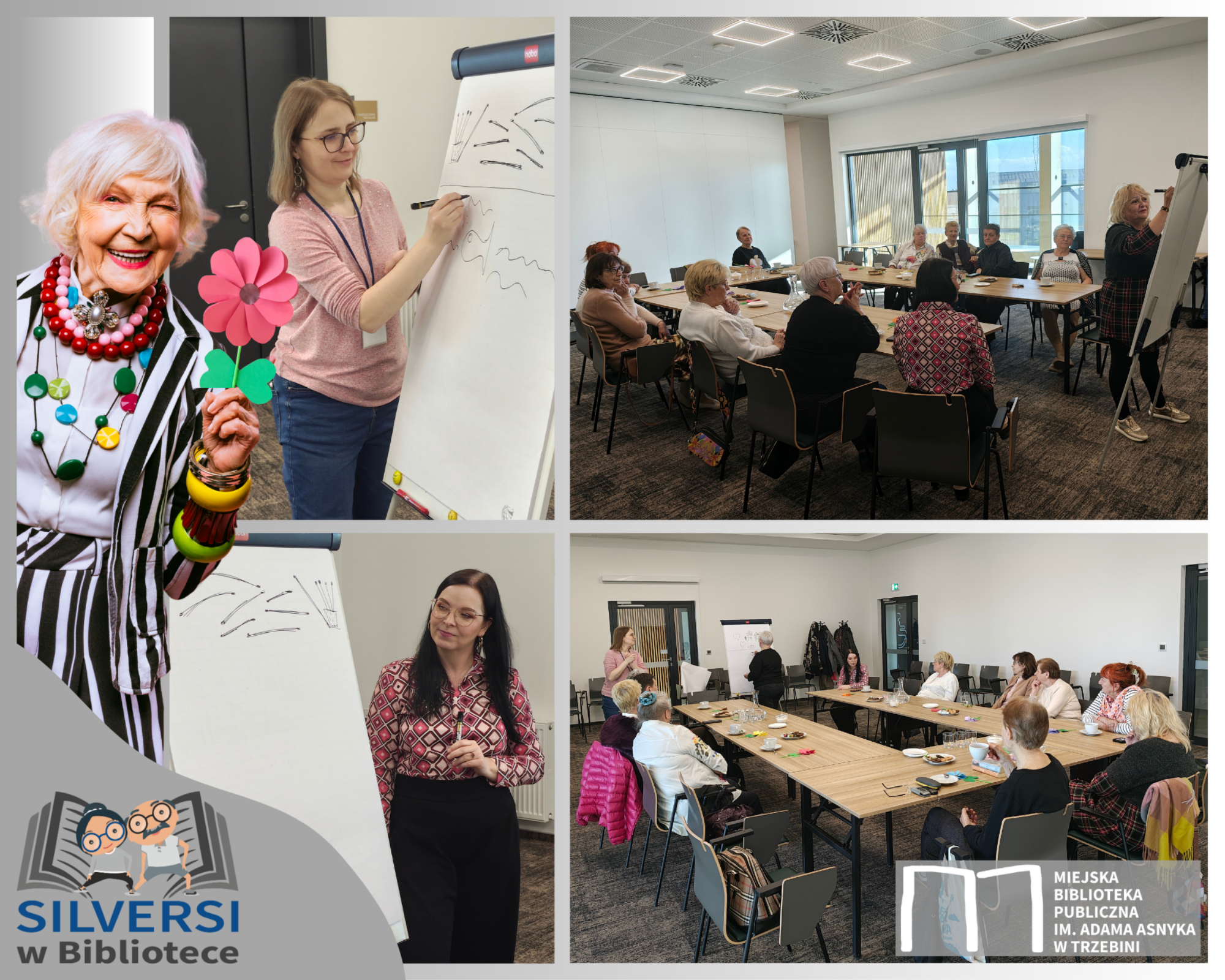 Na wtorkowym spotkaniu „Silversów w Bibliotece” słowa odpoczywały, a w zamian „głos” oddaliśmy naszym zdolnościom artystycznym. Tym razem Kasia i Anetka zaproponowały seniorom zabawę w kalambury rysunkowe. Wyobraźnia poszła w ruch szybciej niż marker, wybuchy śmiechu trzęsły murami Manufaktury, rysunki okazały się prawdziwymi dziełami sztuki (nie tylko abstrakcyjnej), a odgadywanie szło tak szybko, że jedno stało się pewne – w tej grupie jest moc!