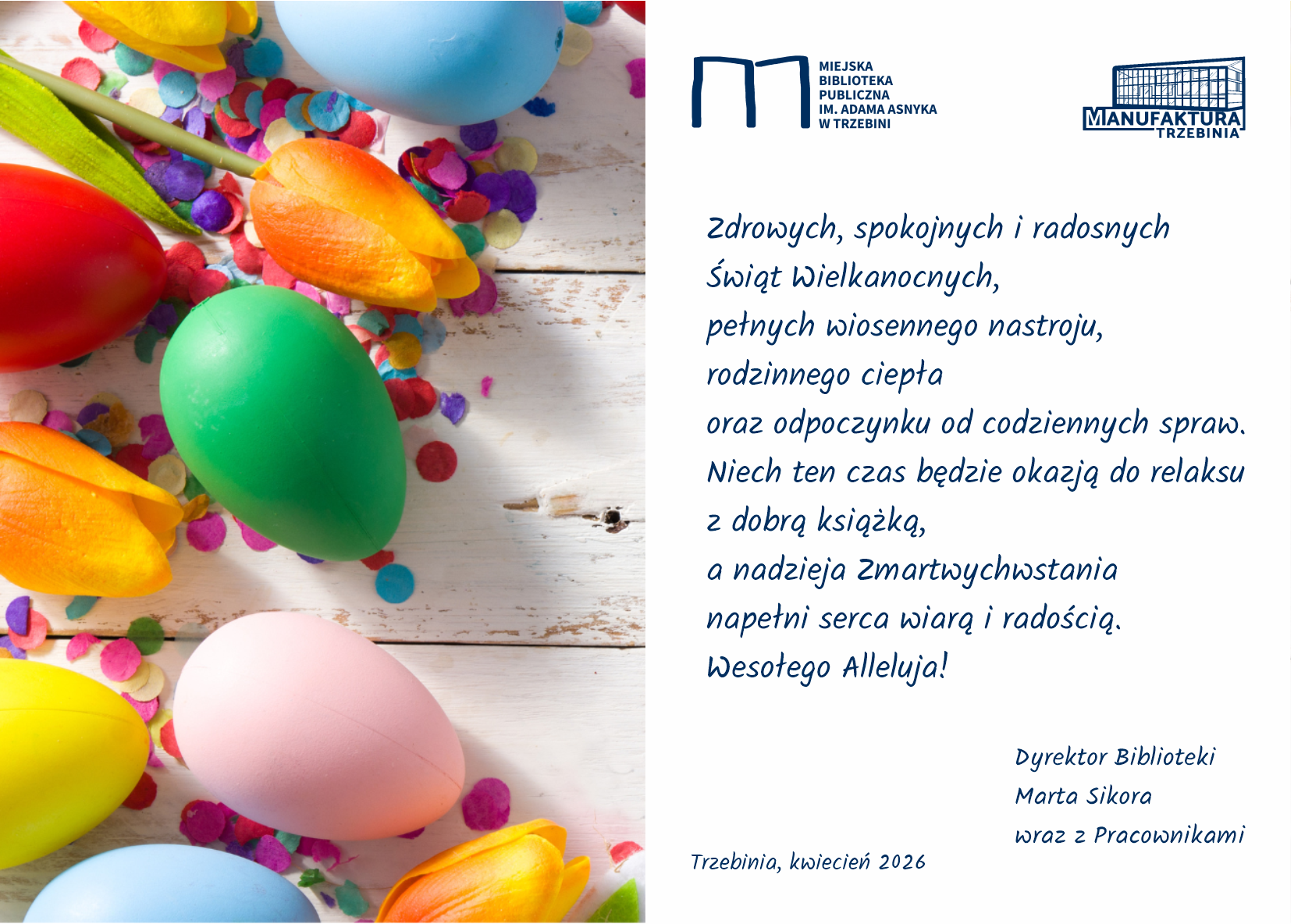 Drodzy Czytelnicy! Z okazji nadchodzących Świąt Wielkiej Nocy życzymy Wam I Waszym Bliskim wszelkiej pomyślności! Wiosennej radości, rodzinnego ciepła, spokoju w codzienności! Smacznego Jajka i choć trochę mokrego Dyngusa, żeby tradycji stało się zadość! I oby w tym świątecznym czasie nie zabrakło akcentów czytelniczych :-) Wesołego Alleluja!