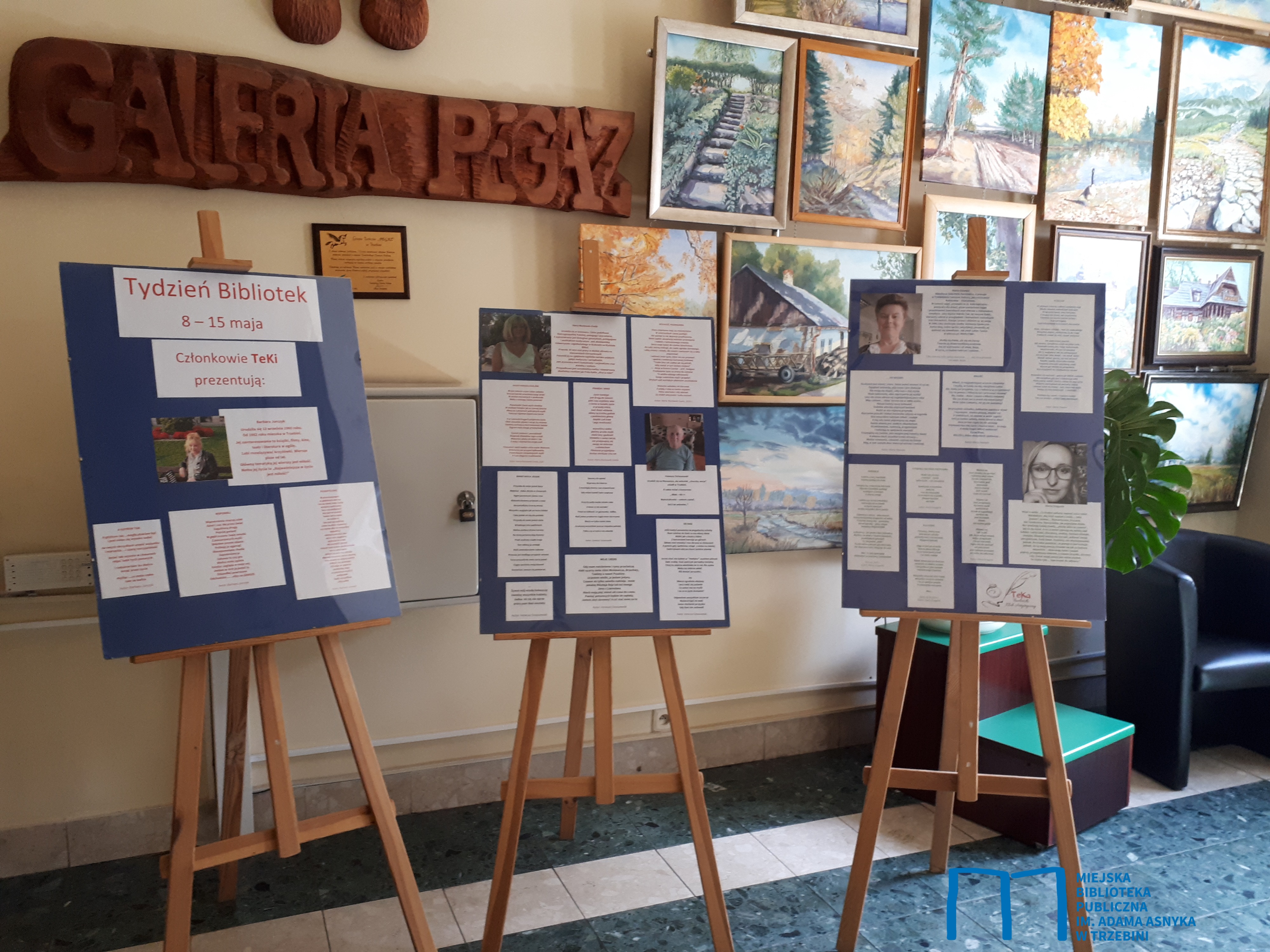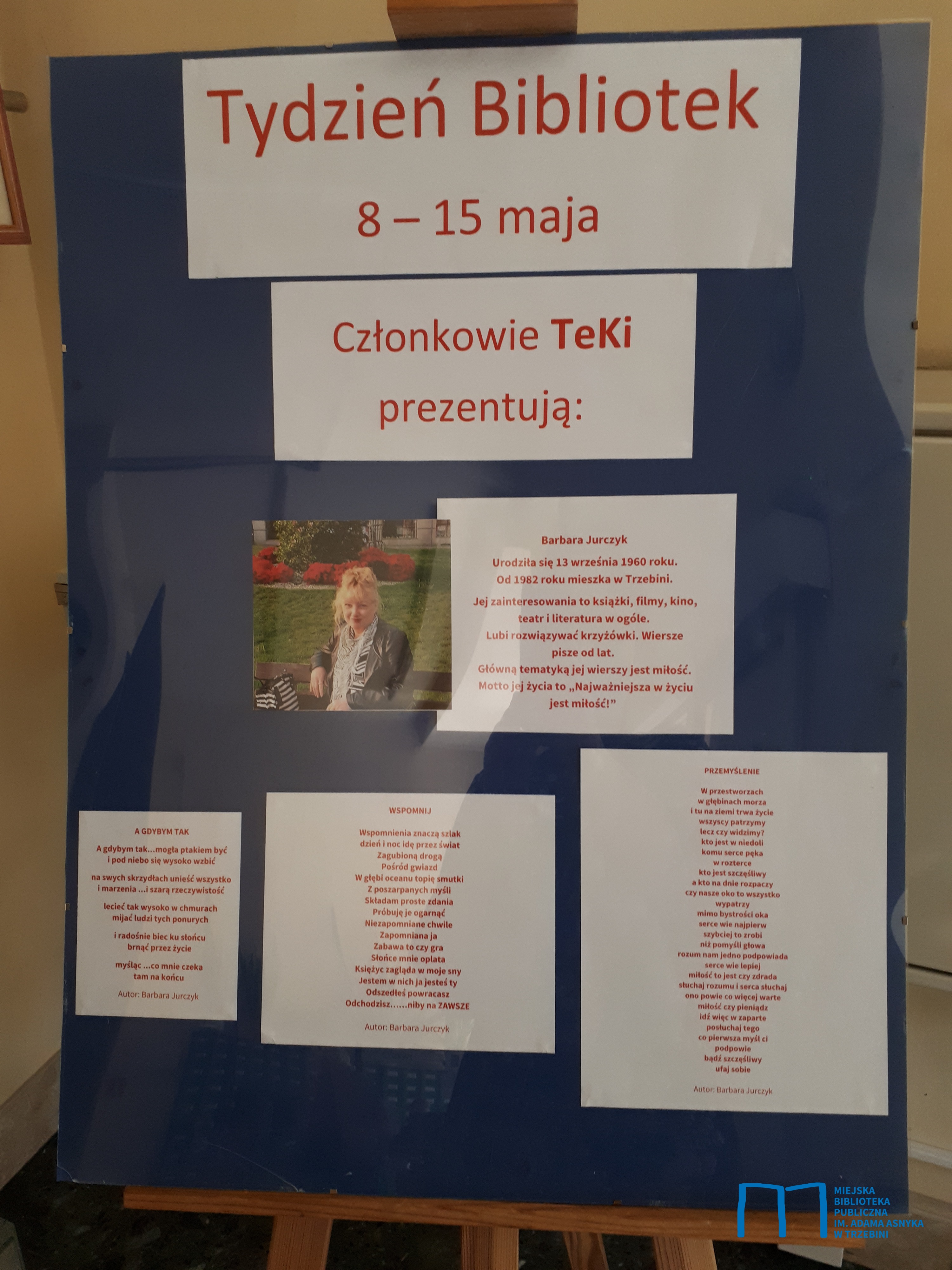 Zachęcamy serdecznie do przyjrzenia się nowej wystawie w holu bibliotecznym. Została ona przygotowana przy okazji obchodzonego w tym tygodniu Tygodnia Bibliotek. Wystawa przedstawia wybrane wiersze członków TeKi czyli Trzebińskiego Klubu Artystycznego działającego przy naszej Bibliotece. Swoje wiersze prezentują na niej Barbara Jurczyk, Maria Wacławek-Owda, Ireneusz Ostaszewski, Marta Stawarz oraz Marta Draganik.