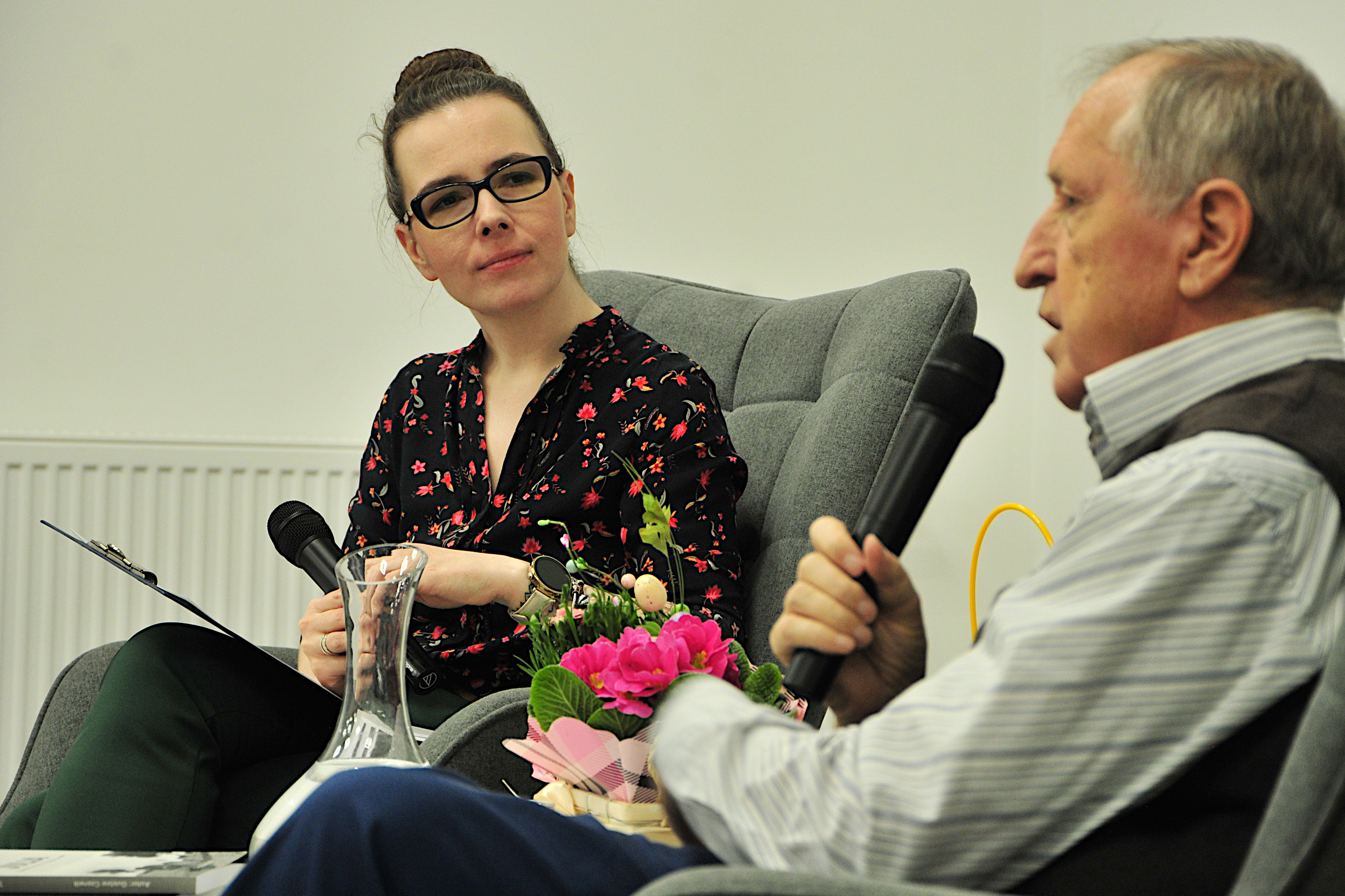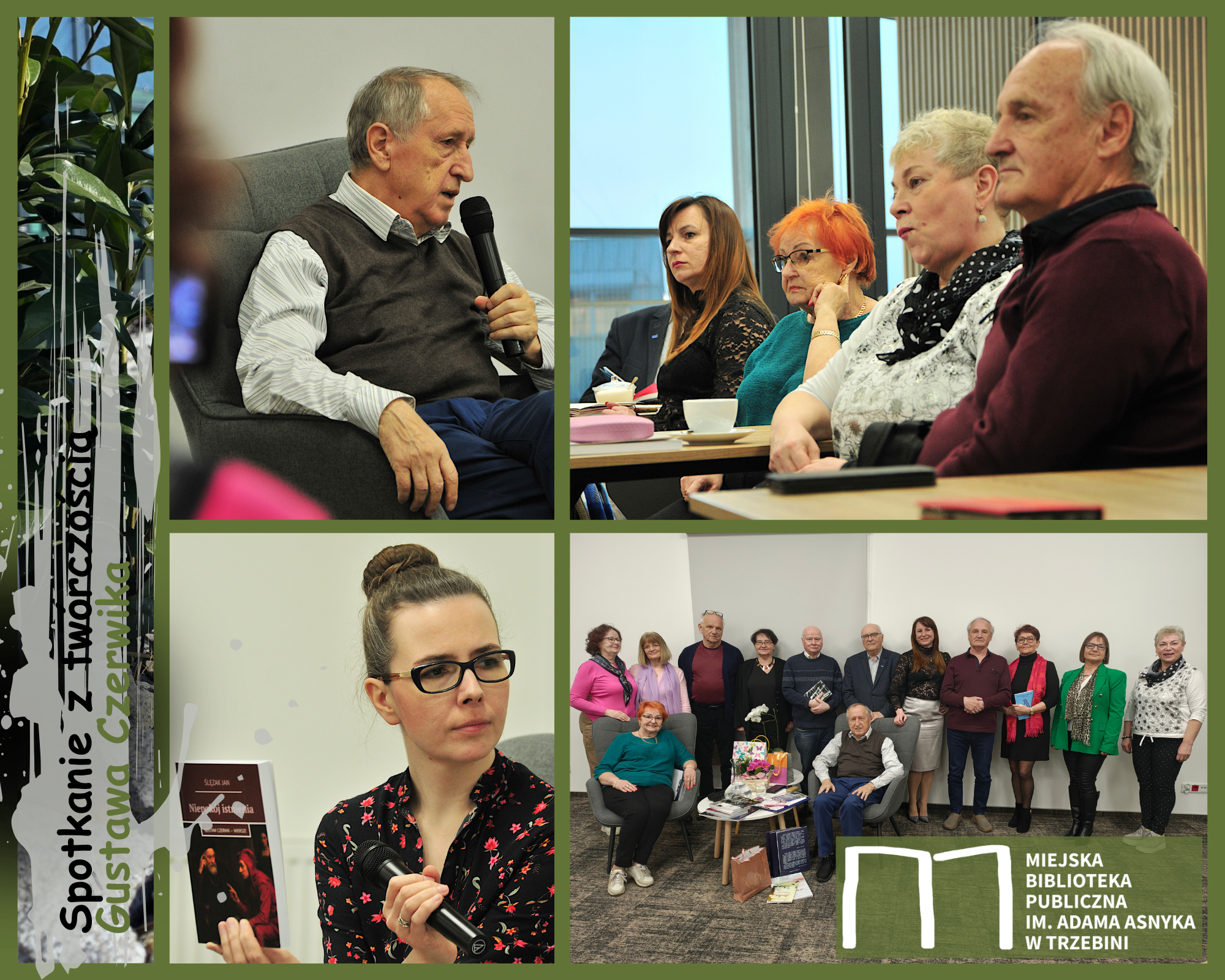 Od dorastania w Osówce w Wielkopolsce i pracę w szkolnictwie zawodowym, przez przeprowadzkę do Chrzanowa i pracę w Fabloku, aż po Sejm Rzeczpospolitej Polskiej – pasjonujący życiorys Gustawa Czerwika porwał słuchaczy w piątkowy wieczór. A gdzieś pomiędzy tym wszystkim po cichu pojawiła się poezja, początkowo pisana bardziej dla siebie, by później rozkwitnąć w tomikach pięknych wierszy. Rozmawialiśmy również o pisaniu wierszy do obrazów i zapoczątkowanym przez Poetę konkursie „Czytany Obraz” oraz o działalności lokalnych grup literackich. Aż w końcu na artystycznej drodze naszego gościa pojawiła się proza, której poświęciliśmy ostatnią część rozmowy. Powieścią „Julia”, łączącą fikcję z biograficznymi wątkami z dziejów rodziny, Autor powraca do Wielkopolski lat swojego dzieciństwa, by udokumentować tamte realia i dowieść jak ważna jest pamięć o przeszłości i swoich korzeniach. Spotkanie zakończyliśmy obietnicą przelania na papier dalszych losów bohaterów, na co już z niecierpliwością czekamy.
